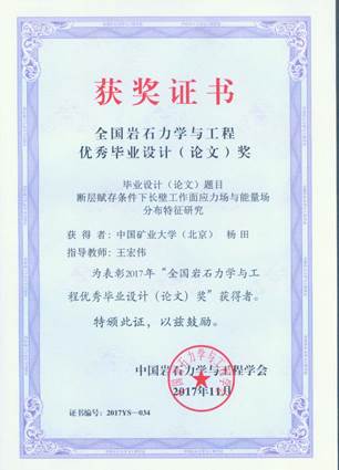 指导学生获得全国岩石力学与工程优秀毕业设计(论文)奖证书