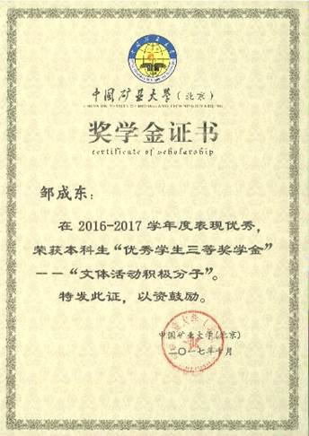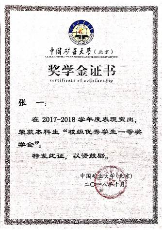 (a)校级特等奖学金获奖证书 (b)校一等奖学金证书