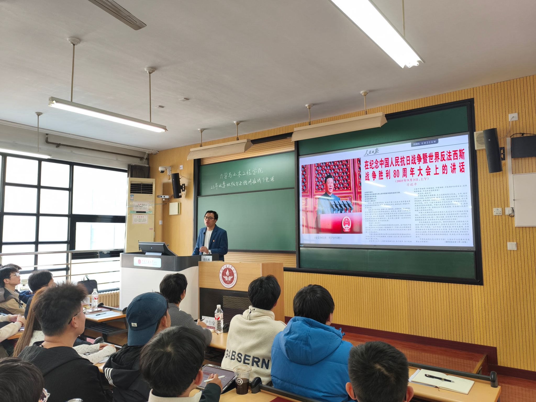 曾庆桃首先从本次赴中国人民抗日战争纪念馆的实践教学活动引入。他谈到,坐落于卢沟桥畔的抗战纪念馆,是中华民族十四年浴血奋战的历史见证。通过实地观看一幅幅历史照片、一件件珍贵文物,同学们对那段烽火连天的岁月有了更直观的感受,对伟大抗战精神的内涵有了更深刻的触动。他指出,组织这次主题党课,正是为了引导大家将参观带来的感性冲击,升华为理性的历史认知和坚定的政治信仰,深刻理解“纪念抗战胜利,坚定民族信念”的时代要求。