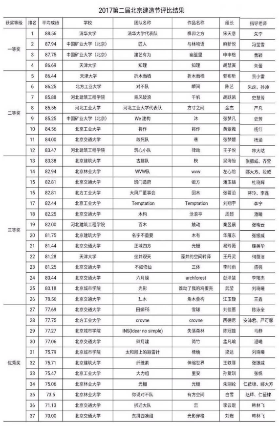 2017年6月3日-6月9日,2017第二届北京建造节在北京交通大学举办,此次大赛由中国科学技术协会科普部作为指导单位,由中国建筑学会、北京交通大学联合主办,由中国建筑学会建筑教育评估分会、科普工作委员会、北京市科学技术协会北京科技咨询中心协办,清华大学、天津大学、北京交通大学、北京建筑大学、北京林业大学、中国矿业大学(北京)等共14所京津冀地区高校、中学共计43组学生组队参加。我校选手匠人队、建艺有为队、We建构队在曹颖老师、冯萤雪老师、史芳老师的指导下,经过两天不眠不休的搭建将作品完美地呈现在赛场上,力压群雄,最终获一等奖两项、二等奖一项的优异成绩。
