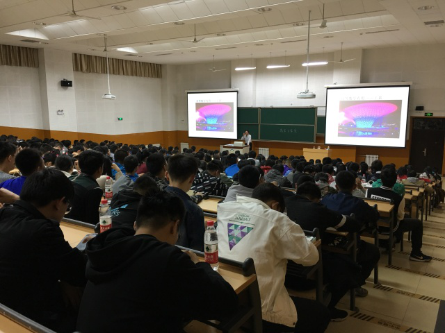 在随后的讲座里,吴楠老师为我们简要地介绍了高等数学课程概貌,用杭州湾跨海大桥等例子详细的阐述了高等数学在土木建筑中的应用。吴老师还生动有趣地向我们介绍了微积分的发展简史,从多个角度对中学数学与大学数学的不同之处做了比较与分析,重点向我们讲述了如何学好高等数学。高等数学与中学数学的区别是高等数学理论性强,为了说明这一点,吴楠老师还现场示范了几个重难点公式的推演。