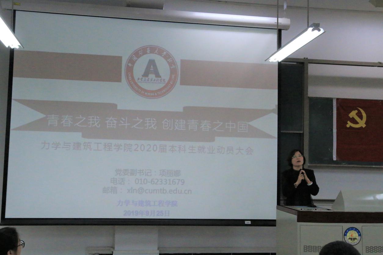 遵照上级党委统一部署,为切实保证“不忘初心,牢记使命”主题教育开展深入,达到时效性针对性,力学与建筑工程学院党委于2019年9月25日召开2015级与2016级“不忘初心,牢记使命”主题党课暨考研就业动员大会。学院副院长宋彦琦,党委副书记项丽娜出席大