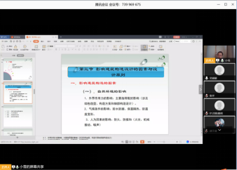 - 冯萤雪副教授的《大型公共建筑设计原理与设计1》课程 - 提前组建微信群,将教材pdf版发至群组,提前通知学生下载腾讯会议软件和雨课堂,根据当天网络情况进行选择。2月18日上午雨课堂无法登录,立即转入腾讯会议软件。视频授课点名,学生将麦克风打开答到,没有麦克风选择打字回复。全班41人全部到课。将腾讯会议软件中共享桌面功能打开,学生与教师同时可见ppt。下课后与学生进行在线交流,询问卡顿与否、视频音频进行是否顺畅,学生反馈纷纷良好。冯老师上课认真,每次设计课与学生的交流都有笔记记录,常年积累,课间及课下师生交流充分,授课效果很好。