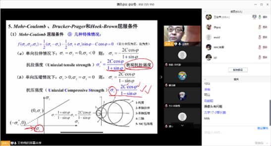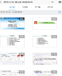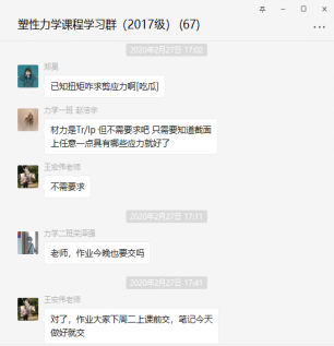 按照学校统一部署,以线上线下混合式教学模式做好疫情防控期间教学计划。王宏伟副教授在开学前期调研了各种网络教学平台,组织学生建立了微信学习群,发布通知、课程答疑、课后作业布置等工作;选择使用腾讯会议开展课程的线上教学,并同时结合雨课堂发布PPT教学课件;采用线下重点难点录课,通过公共邮箱发送给学生供他们学习塑性力学在线教学主要分以下三个部分: