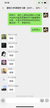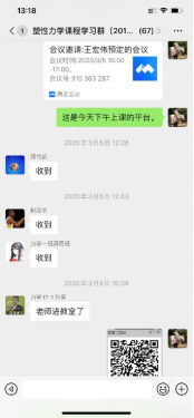 (1) 每周二、周四上课前在微信群里提前预定好腾讯会议时间,通知同学们来上课,同学们积极回复提前进入在线课堂;在课前通过微信群进行点名,积极督促同学们上课;