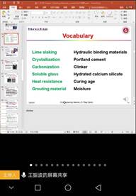 在同学们的帮助下,我很快把微信课程群建立起来,形成以微信群为阵地、以录屏+直播开展的云端课堂。首先把中、英两个版本的课件提前一周发布到微信群,督促同学做好预习。接下来是录屏,PPT自带的录屏功能可在放映状态下添加录音讲解,之后可保存为视频格式。但录课并不是每次都能顺畅的进行,出现口误、卡壳的页面都要重新录,通常1个小时的视频要录2个小时,加上视频压缩、剪辑、上传这些必要的操作,时间还会更长。录屏的噪声也引起我的注意,第一次课后有学生反映杂音较大,我经过反复调试设备终于把这个问题解决。网络教学的确要在投入时间上做好加法。
