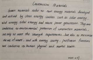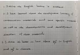 建筑材料这门课程内容偏多,偏广,为了使同学在学习过程中了解重点及其英文表达, 课后的作业显得至关重要,除了一些课本要求的课后问题外,我还引申了一些关于建筑材料发展的理念和未来趋势的思考, 比如Sustainability, Green Material,通过这些课本中没有答案的问题,引导同学们通过自己的理解和查询去挖掘对这些基本理念的理解, 并使用英文表达出来。 从同学们的作业中, 我可以看到他们的自主查询思考的努力,每个人的答案非常类似,但几乎没有重复。 这是我在教学中反复强调的学习态度,注重自主独立性的思考,同时兼听则明。同时也是在语言学习中对文化理解过程中不可避免的一部分内容, 需要拓宽视野,通融知识,这样才能提升素质,成为双语型的人才。