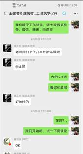 网络教学手段虽然比较成熟,但是对于我和很多的同学们来说, 还是第一次。为了了解同学们在家里所拥有的网络资源和上网方式,我首先尝试通过微信建群的方式,把上课的同学们都加入到这门课程的班级群里,欣慰的是所有同学都可以使用微信联系到,这样为硬件准备具备了一个坚实的基础,并实现了沟通保障。同时督导组的老师也顺利的加入。接着就是通过接龙程序,统计得出了同学们在家里所拥有的网络资源和上网方式,结果是所有同学都可以上网和使用手机,只有2个同学没有电脑。根据这样良好的状况, 我决定使用直播的方式授课,使大家进入有规律的作息和学习。