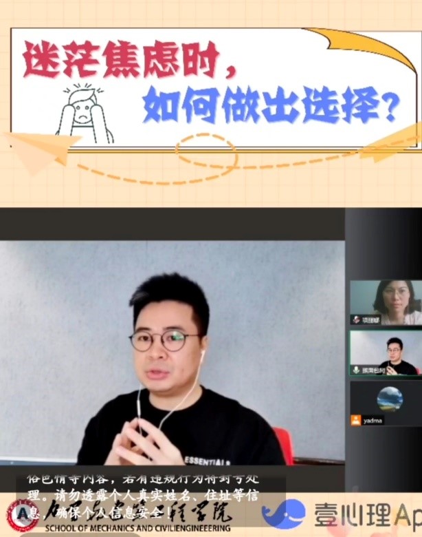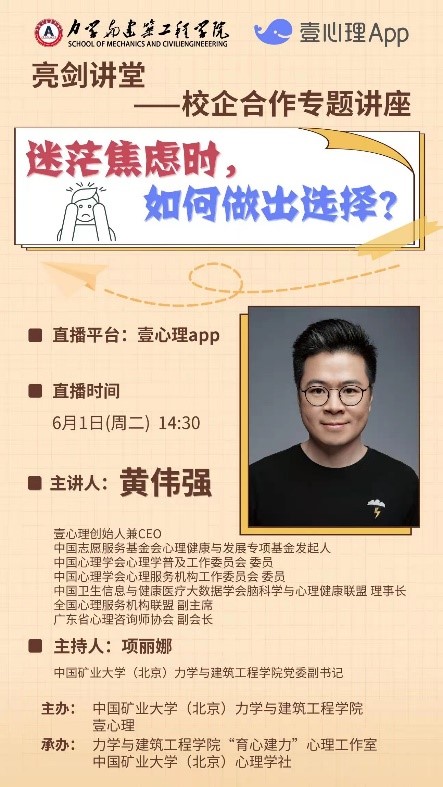 2021年6月1日14:30,力学与建筑工程学院联合壹心理举办了“亮剑讲堂之校企合作专题讲座”。我院“育新建力”心理工作室和心理学社特别邀请了壹心理创始人兼CEO黄伟强为我院师生做主题为“迷茫焦虑时,如何做出选择”的线上直播。讲座由我院党委副书记项丽娜老师主持,观看直播人数达2000人。