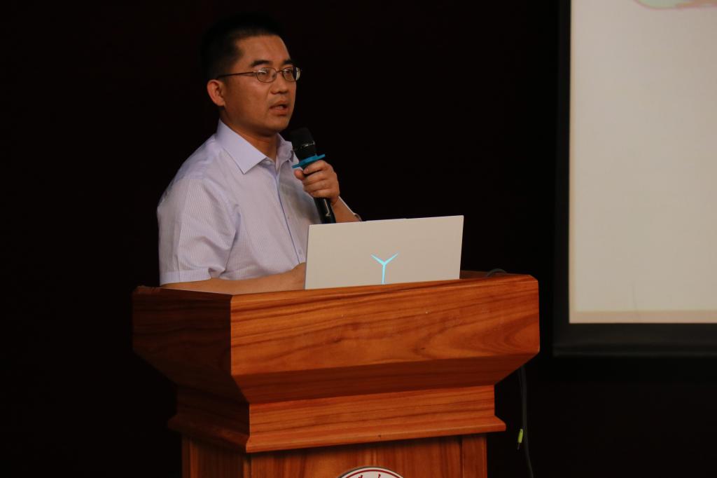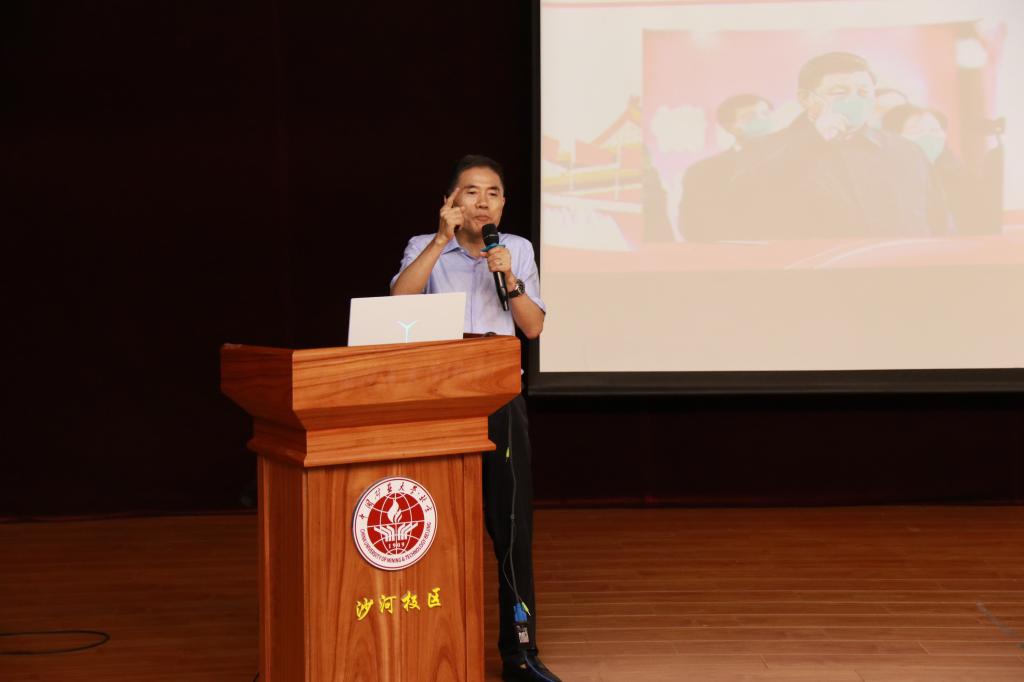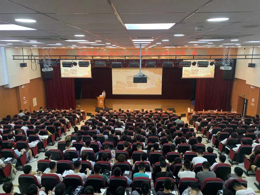 院党委副书记项丽娜老师以“‘力’尽千帆,双导并驱促成长;‘建’功立业,三全育人成大才”为主题出发,从新生概况、校园生活、奖助体系、升学就业、安全提示等方面作报告,表示学院以立德树人为己任,做好全员育人、全程育人、全方位育人,切实为国育才、为党育人,服务学生成长成才。她着重强调了疫情期间的校园管理,非必要不离校,提高警惕,防范校园诈骗和校园传教。