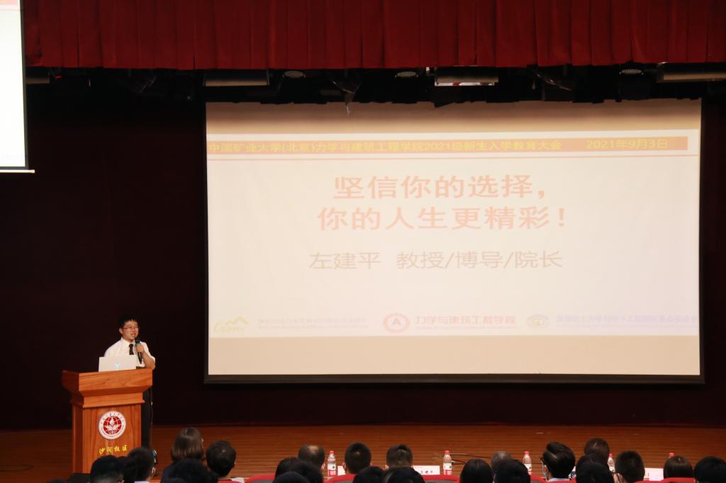 院长左建平教授以“坚信你的选择,你的人生更精彩”为主题,详细介绍了学校、学院历史沿革和发展历程,就师资队伍、科学研究、学科建设、校园文化、学生培养、国际交流等多方面内容作了报告,充分展示了我院对学生基础知识、科研能力和创新意识的重视培养。他表示,经过一代又一代矿大人的努力奋斗,学校铸就了中国能源工业高等教育的一流品牌和独特的精神文化品格,希望新生把握机会,辛勤付出,努力奋斗,要为建设世界一流能源科技大学贡献青春力量。