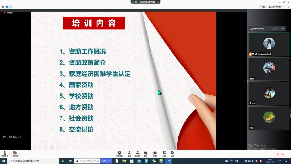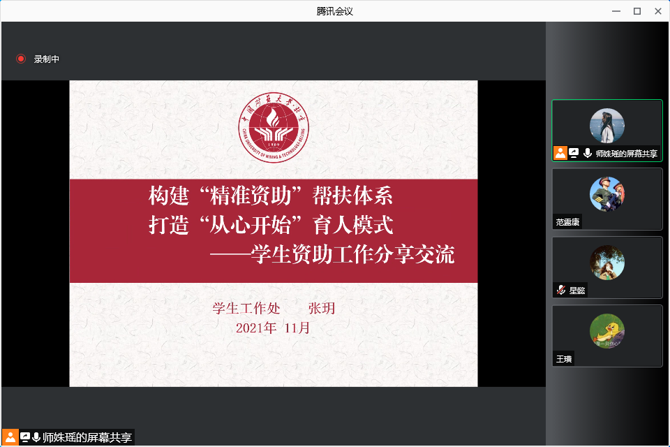张玥老师分别以资助工作概况、资助政策简介、家庭经济困难学生认定、国家资助、学校资助、地方资助、社会资助、交流讨论为主要内容展开讲述,展示学生资助系统的实际运用,介绍我校学生资助工作的特色做法,并结合真实案例讲述学生资助工作中的重点和难点。