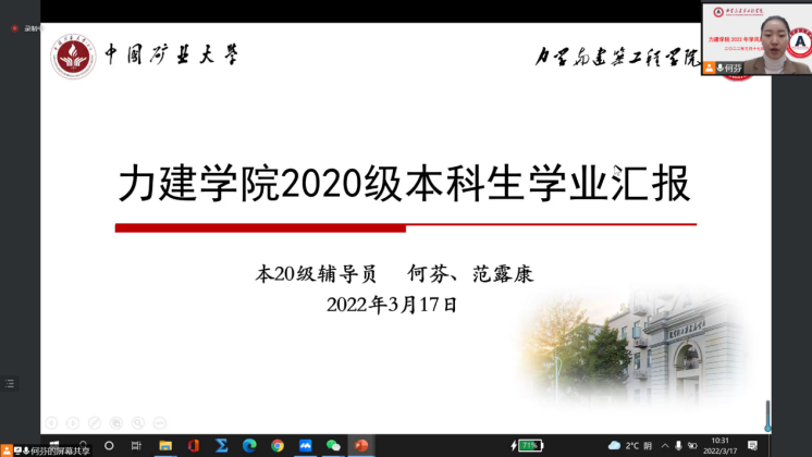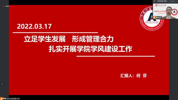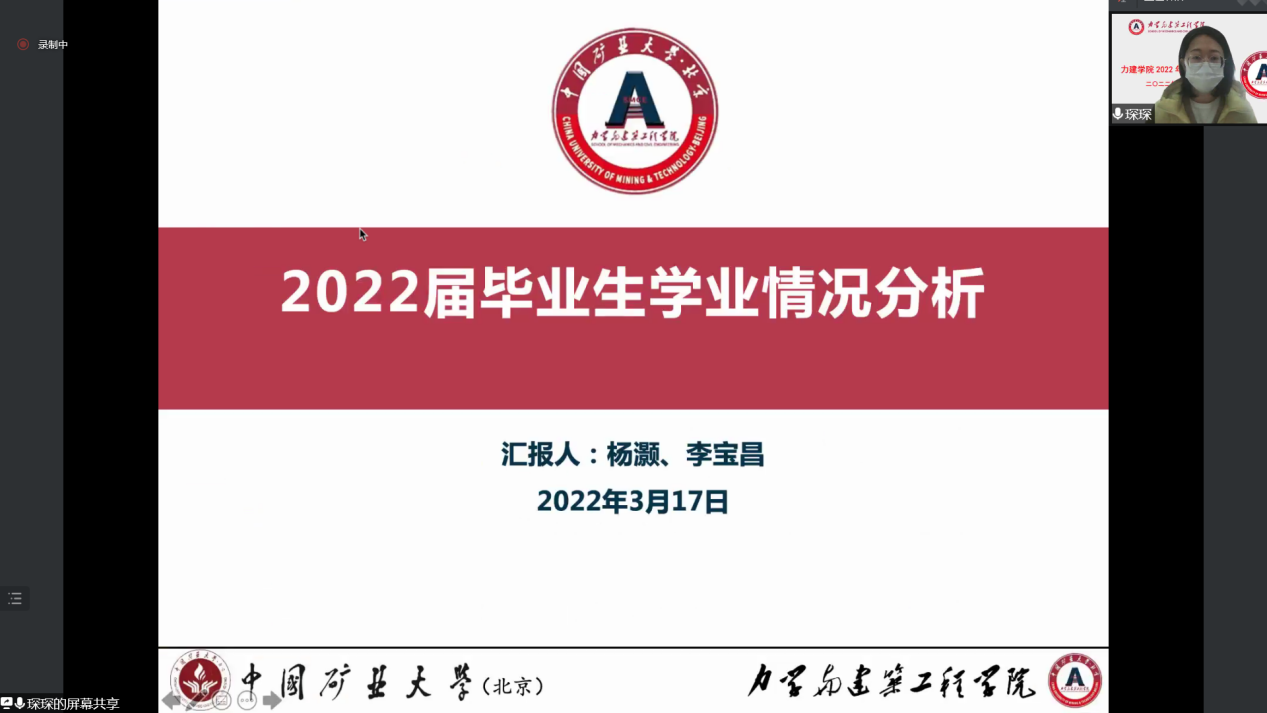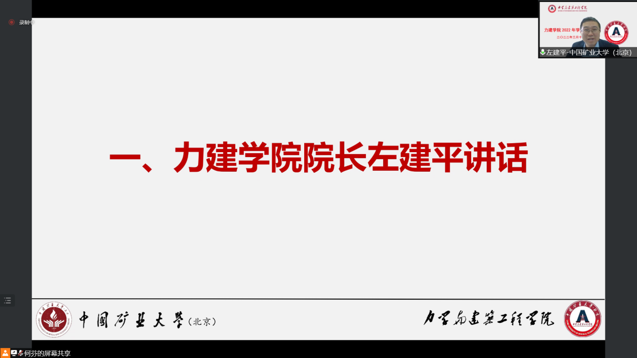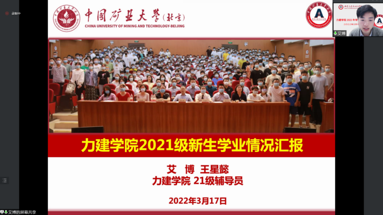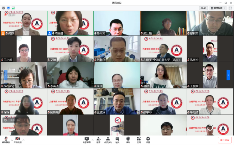 为加强学院学风建设,扎实推进学院立德树人根本任务在当前疫情防控常态化的背景下,2022年3月17日上午10点中国矿业大学(北京)力学与建筑工程学院线上召开了力学与建筑工程学院2022年学风建设大会。力建学院院长左建平教授、副院长岳中文教授、党委副书记项丽娜老师,各系(中心)本科教学主任,本科生教学秘书、各年级班主任及辅导员参加此次大会,会议由党委副书记项丽娜老师主持。