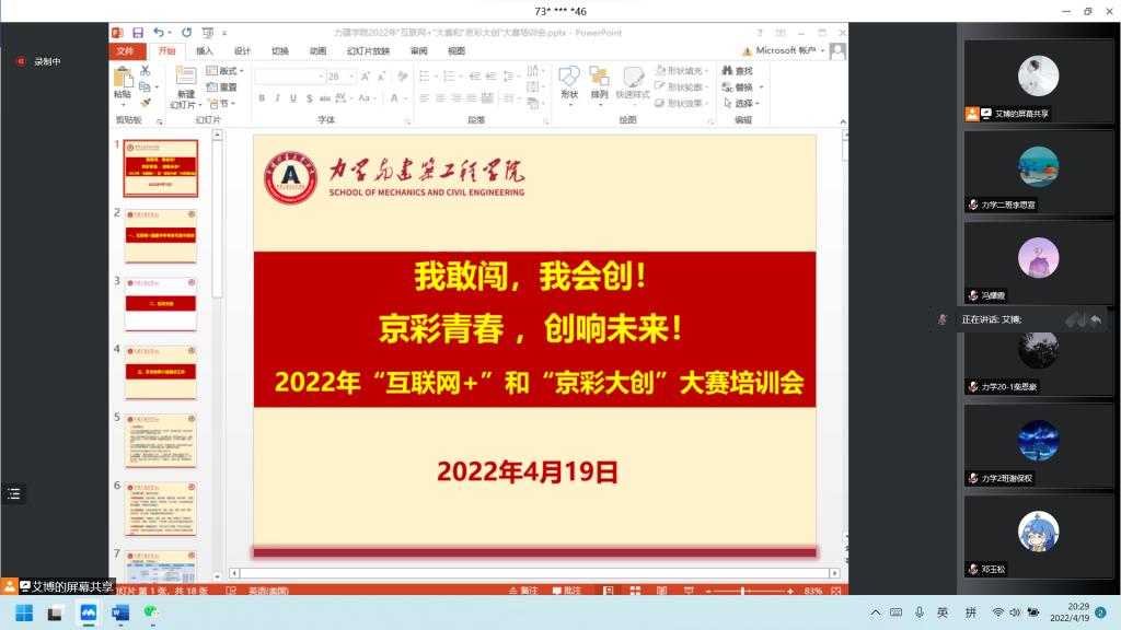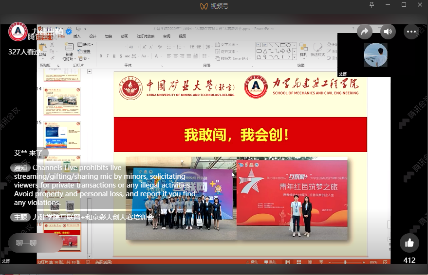 为做好中国矿业大学(北京)2022年创新创业大赛作品推荐工作,4月20日19点,我院召开“互联网+”和“京彩大创”竞赛培训会。邀请到教育部首批万名优秀创新创业导师、“创青春、挑战杯、互联网+”评审专家马莹作培训,辅导员艾博主持会议并介绍有关组织工作。