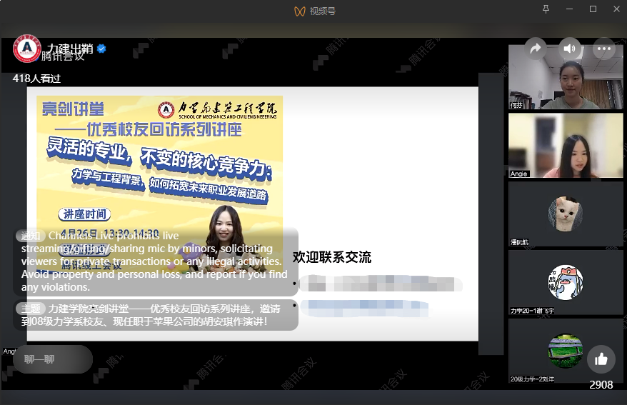 为扩大讲座的影响力,本次讲座同时在我院官方视频号“力建出鞘”进行同步直播,利用双平台为同学们提供了灵活的学习方式,线上观看的人气最高到达了418人次,同学们也纷纷为胡安琪的生动亲切的教诲点赞,点赞数高达2904次。