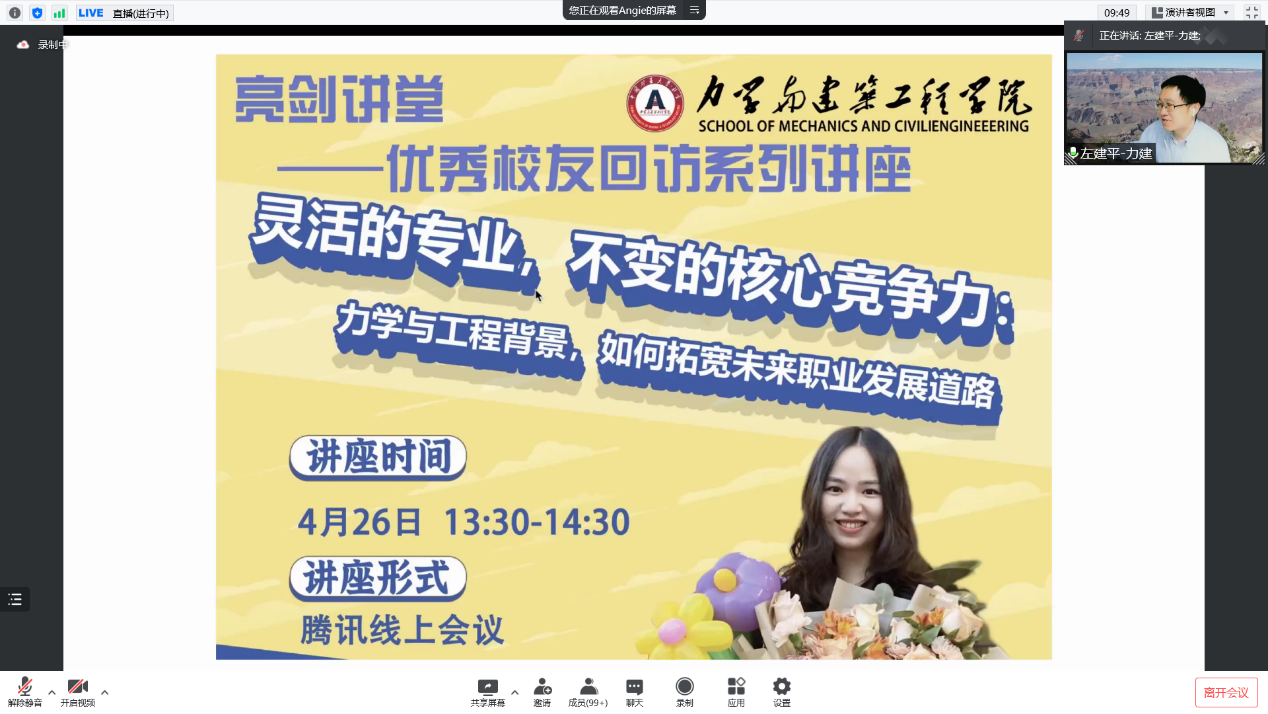 讲座伊始,左建平院长发表讲话。他对胡安琪为我院师生做主题讲座表示欢迎和感谢,并与胡安琪交流了关于在母校学习生活方面的往事,展现了十分融洽的师生关系。左建平院长提到,力学是一门基础学科,也是一门应用学科,尽管力学很难学,但力学专业培养出许多优秀人才。左建平院长鼓励在线上学习的同学们保持积极向上的心,要认真、踏实地学习。最后左建平院长表示,无论所学专业难与否,只要认真学、学好、学有所成,就会有所成长。