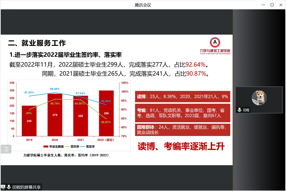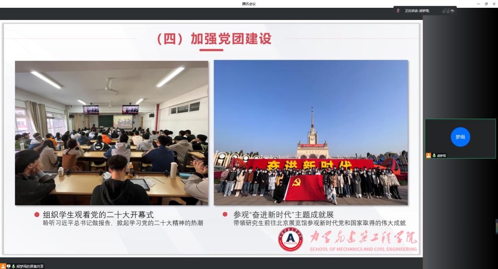 为进一步提升我院辅导员素质能力建设,促进辅导员工作交流。1月3日上午,力学与建筑工程学院组织召开2022年度辅导员工作汇报分享会。院党委副书记项丽娜出席会议,学院全体专兼职辅导员依次进行工作汇报,会议由院团委副书记何芬主持。