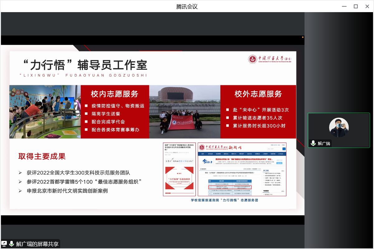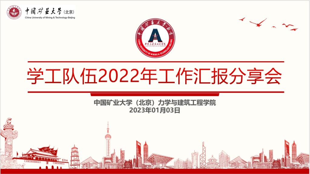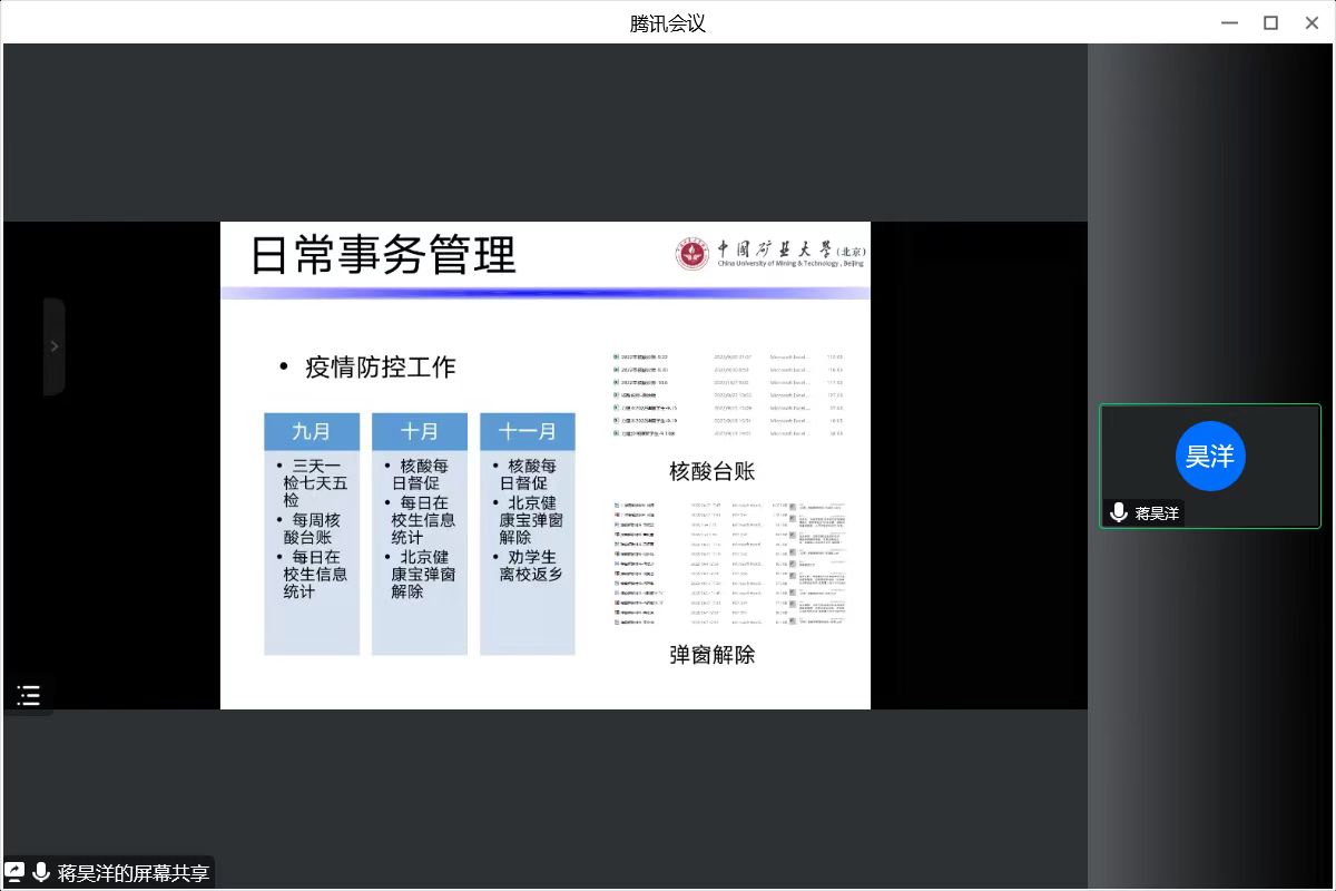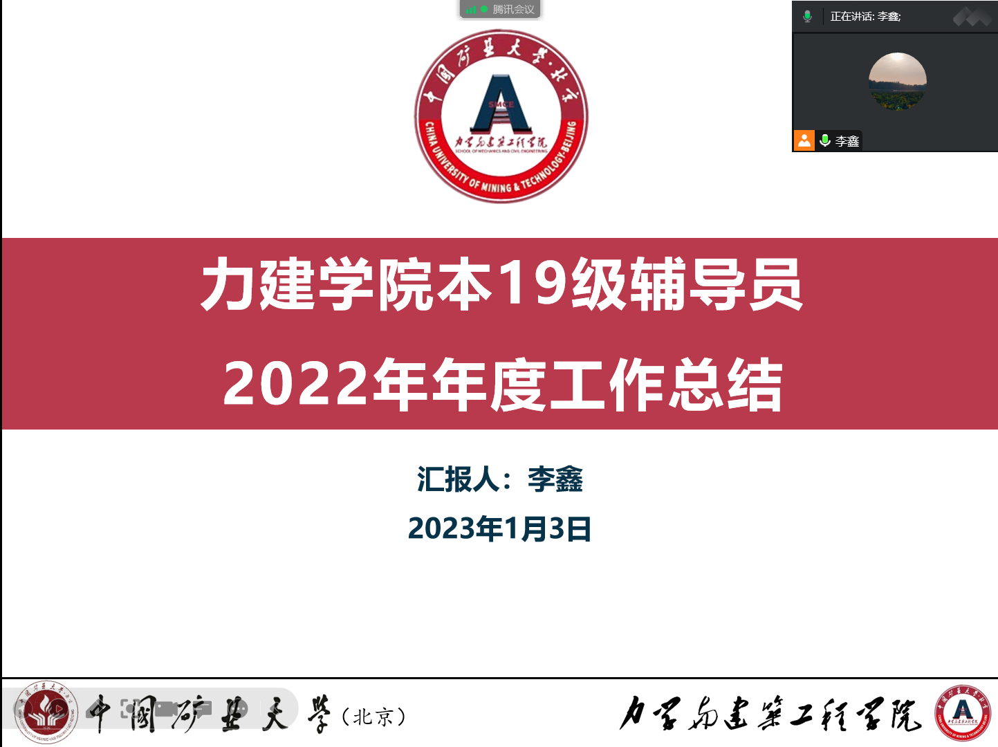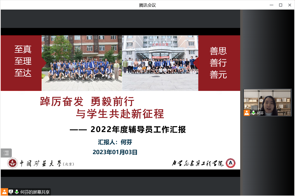院党委副书记项丽娜认真听取了辅导员们的汇报分享情况并做总结讲话。她充分肯定了我院全体辅导员老师过去一年的辛勤工作和育人成绩,尤其在打赢高校防疫攻坚战中所做的贡献。项书记指出我院辅导员队伍是一支有活力、有动力、有效力、有聚力的队伍,同时对接下来的工作提出三点要求:第一,找准工作方向,各位辅导员对照《中国矿业大学(北京)2023年工作要点》,继续做好学生成长成才的引路人。第二,明确工作定位,充分发挥学生工作教育、管理、服务的职能,不断提高辅导员专业化职业化建设。第三,凝练工作特色,做好日常工作素材积累,牢牢把握特色和成果两个工作抓手,将个人特色与专项工作相结合,凝练工作成果。