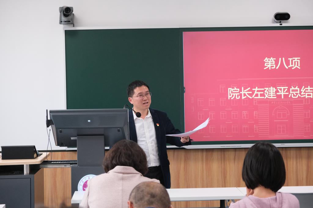 院长左建平总结讲话。他充分肯定了近年来我院在学风建设工作上取得的成绩,同时指出毕业年级考研成功率降低等问题,说明了进一步推进学风建设的紧迫性。他就学院学风建设未来发展提出了要求,第一,学院领导和各系主任要有担当、有行动,努力加强学风建设,为国家和党培养人才;第二,班主任要有情怀,勤奋管理班级、关心同学;第三,辅导员要结合管理与专业两方面,积极加强与系主任、学生导师、班主任沟通对接,形成管理合力。