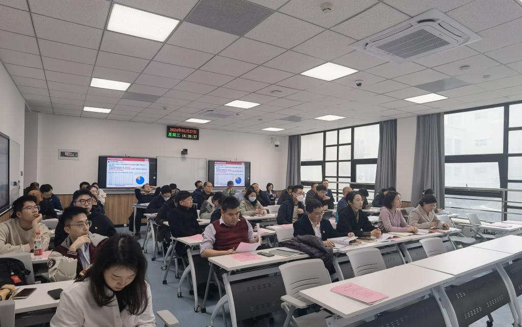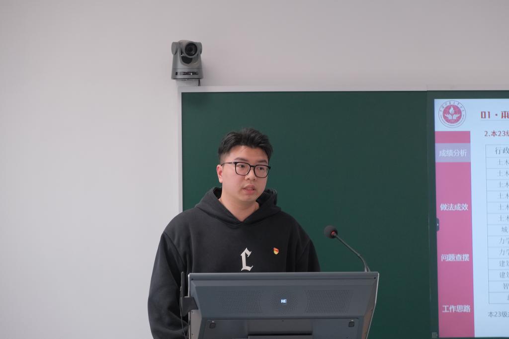 学院办公室主任、“好学至善”学业辅导工作室负责人何芬为学院学风建设情况做出了分析报告。她详细分析学院2021-2024年考研升学数据,指出应引导学生自主思考未来方向,提高学生的内生动力。各年级本科生辅导员对依次对本年级学习情况进行了汇报,详细说明了各年级、班级的挂科率、四六级通过率等情况,指出学生学习积极性不高、学习态度不端正等问题,并将对挂科门数较多的同学采取针对性解决方案,帮助学生提高成绩,降低挂科率。