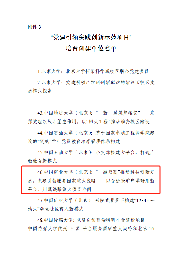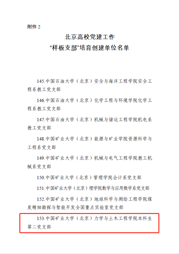 我院党委申报的单位和项目全部获评,2024年党建工作取得新的突破和重要进展。“力学与土木工程学院党委”入选北京高校党建工作“标杆院系”,“力学与土木工程学院本科生第二党支部”入选北京高校党建工作“样板支部”,力学与土木工程学院党委联合能源与矿业学院党委负责申报的《“一融双高”推动科技创新发展,党建引领服务国家重大战略——以先进采矿产学研用新平台、川藏铁路重大项目为例》入选“党建引领实践创新示范项目”。
