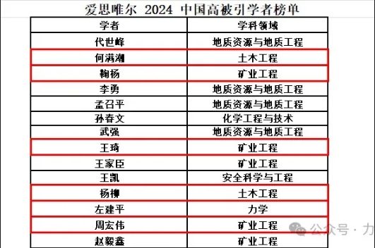 我院岩土工程和工程力学老师何满潮院士、鞠杨教授、周宏伟教授、左建平教授、王琦教授、杨柳教授6名学者入选。