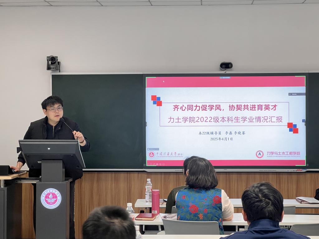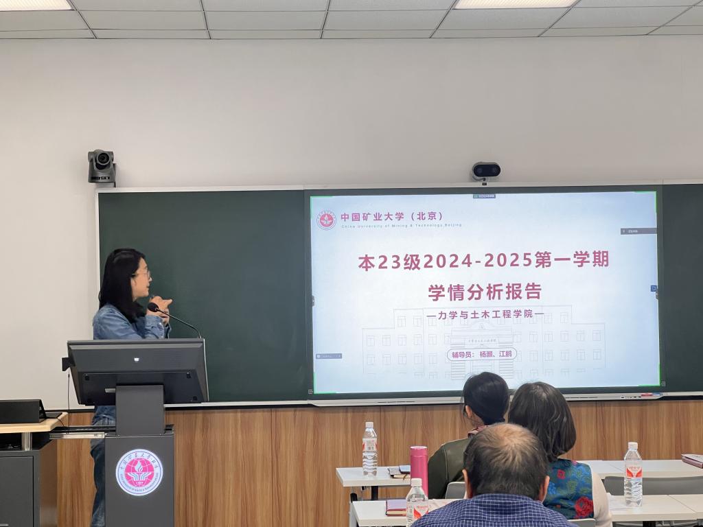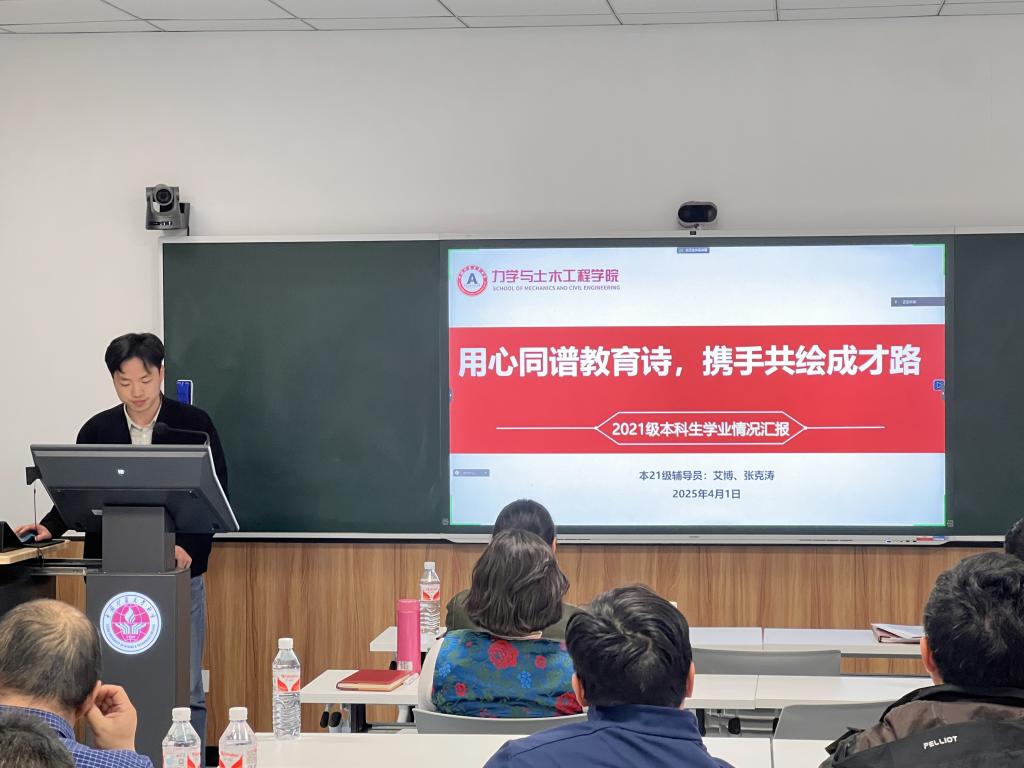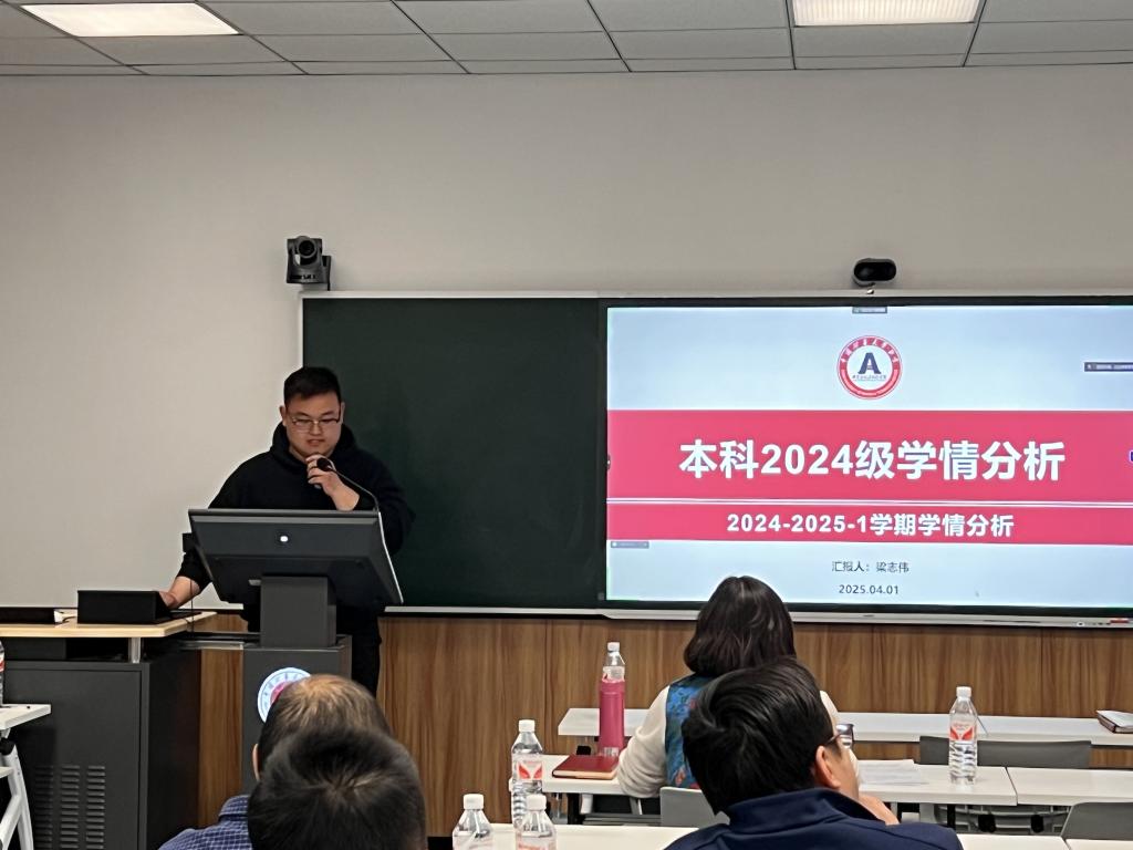 本21级辅导员艾博、22级辅导员李鑫、23级辅导员杨灏、24级辅导员梁志伟依次对本年级学情分析进行了汇报,横向对比本年级在各学院的挂科排名情况,详细说明了各专业、班级、宿舍的挂科率对比情况,毕业生就业去向落实率等情况,分析了学业现状主要原因,指出学生专业认同感低、学习存在畏难情绪等问题,并采取搭建帮扶平台、深入同学内部等解决方案,构建多轨支持体系。