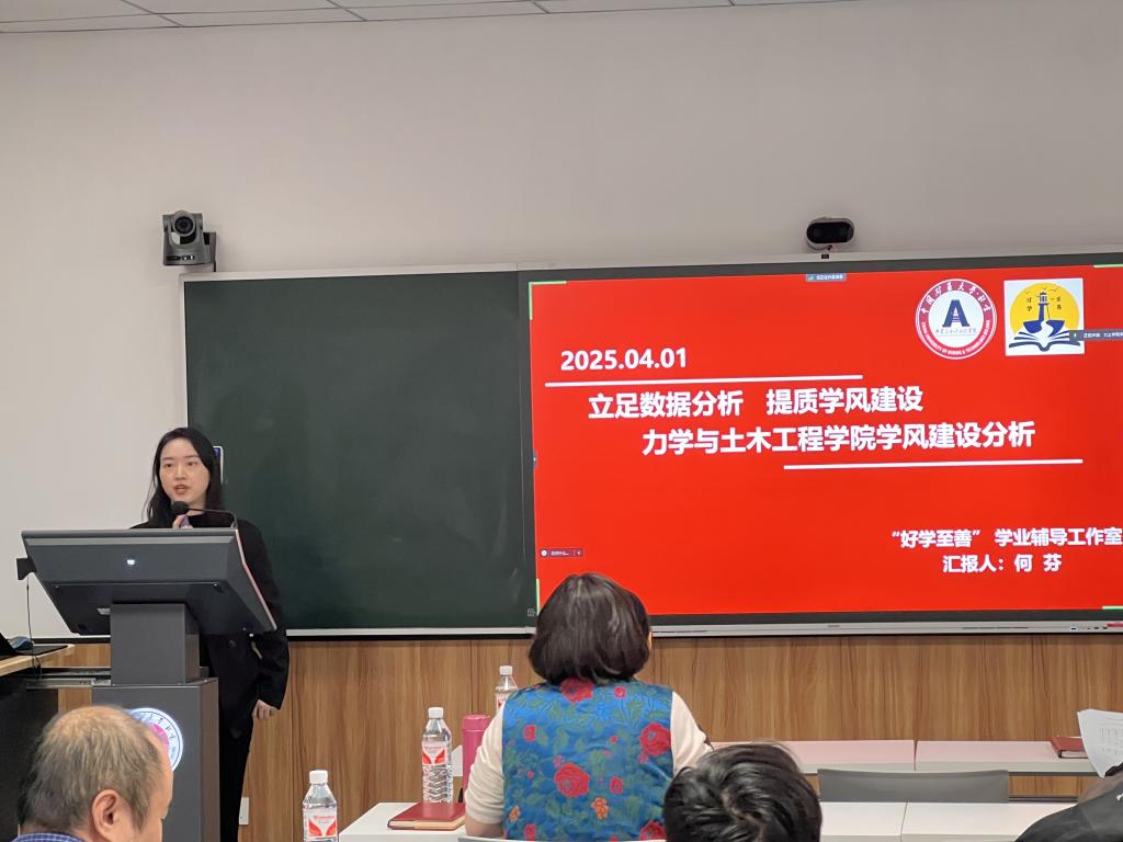 “好学至善”学业辅导工作室负责人何芬为学院学风建设情况做出了分析报告。她介绍了工作室2024年主要开展的工作情况,分专业详细分析学院2024届毕业生升学率、就业率、落实率等各项数据,2025年二战学生考研数据等。学院本科教学秘书徐志超以春季学期学业预警数据为依据,剖析了我院各专业、各年级在学习过程中可能面临的挑战及课程薄弱环节,并对去年秋季学期与本次预警数据的变化趋势进行了对比分析。