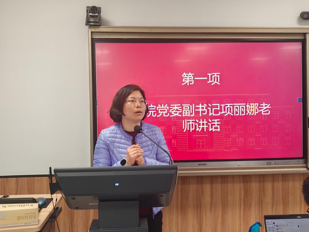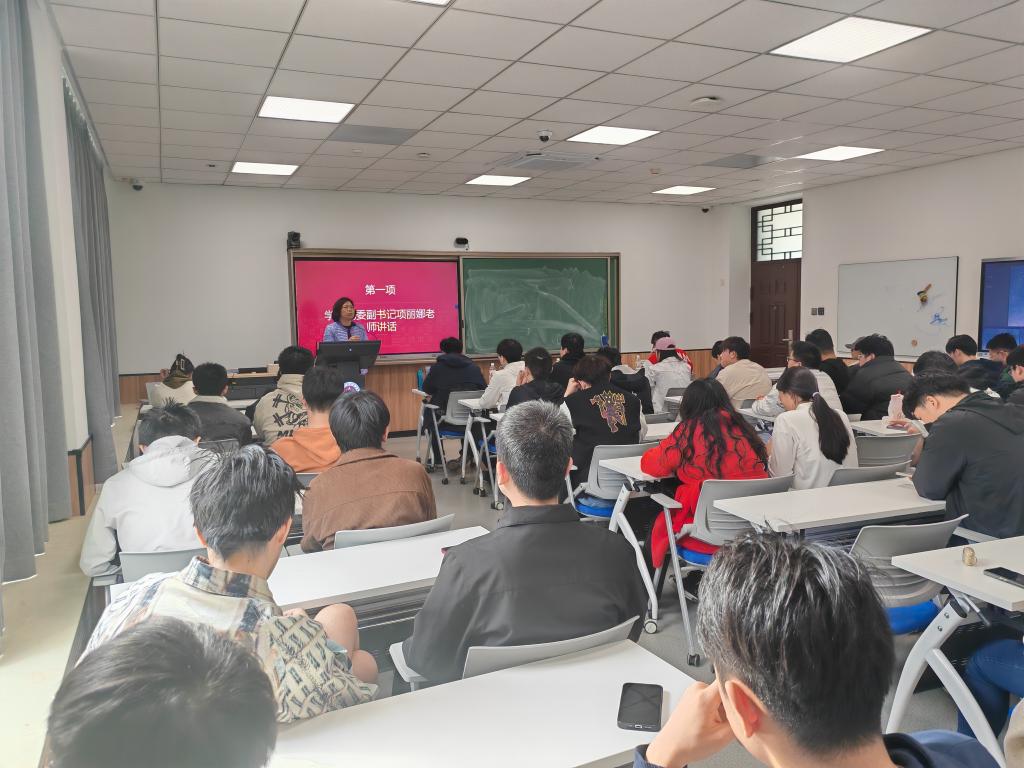 项丽娜老师作专题动员讲话。她首先传达了学院党政领导班子对毕业生的殷切期望,强调"学院始终是同学们坚强的后盾"。针对学业困难群体,项书记提出三点承诺:建立"一生一策"帮扶档案,;针对就业群体,要求辅导员团队构建"就业动态跟踪机制",联动校企合作单位拓展岗位资源。她特别指出:"无论同学们身处校园还是迈向社会,学院的大门永远向大家敞开。"