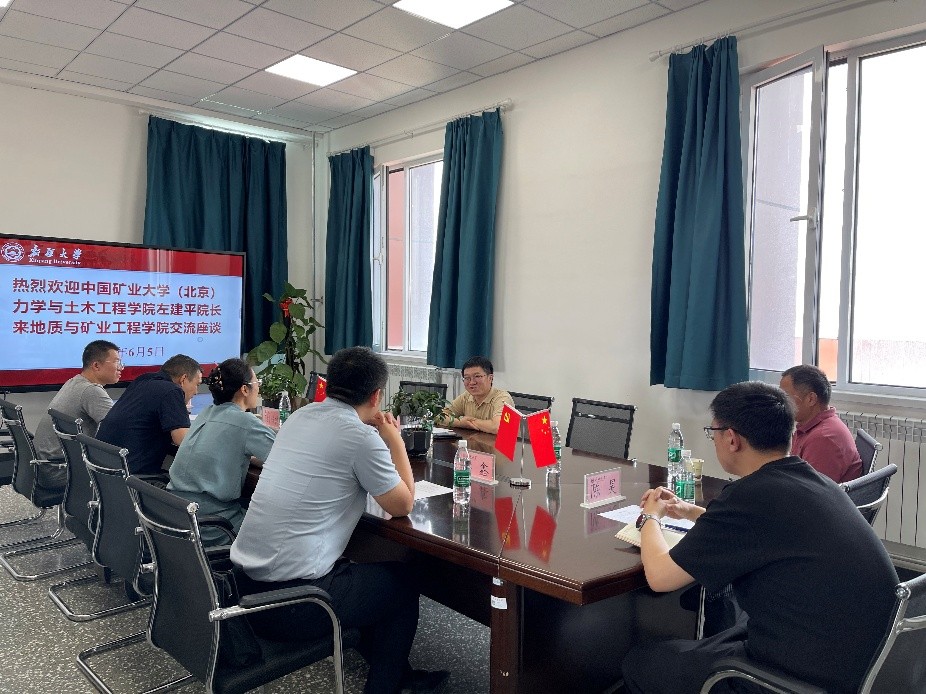 在全面贯彻落实党的二十大精神、深入推进教育强国战略。2024年6月5日,学院院长左建平教授一行前往新疆大学地质与矿业工程学院走访交流。会议重点围绕深化两院合作、党建工作、研究生招生宣传、学科建设及人才培养等议题进行深入交流。此次访问不仅是两校落实“一带一路”倡议、服务国家能源安全与西部大开发战略的生动实践,更标志着我国高等教育在区域协同创新、人才战略布局上迈出了坚实步伐。新疆大学地质与矿业工程学院党委书记孙琳杰,党委副书记、纪委书记阿地力·多力坤、学院党委委员、学术副院长李鑫出席会议,学院党委组织员、教师代表参加会议。
