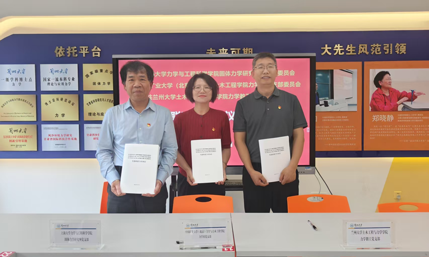 6月19日,我校力学与土木工程学院院长左建平一行、上海大学力学与工程科学学院院长张田忠一行同赴兰州交流。兰州大学土木工程与力学学院党委书记韩伟、院长王记增对两所高校老师们的到来表示欢迎,介绍了兰州大学基本情况和学院支部建设情况,表示希望通过跨区域、跨学校的支部交流,为支部建设提供新的思路,焕发支部创新的活力,期待未来在人才培养和科学研究等诸多领域展开深层次的合作。会上,我校力学系党支部书记祝捷从党建融合课程思政,增强教书育人的能力,提升学生核心素养三方面汇报支部建设做法,以实例讲述党建与业务融合发展、党建引领业务取得的成果。我校力学系党支部、上海大学固体力学研究所党支部、兰州大学土木工程与力学学院力学教工党支部联合举行党建签约仪式。
