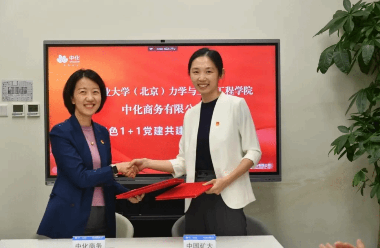 会上双方签署了党支部红色“1+1”共建协议书,学院教师行政党支部、硕士2023—3班党支部与中化商务有限公司职能第一党支部在未来开展支部共建。