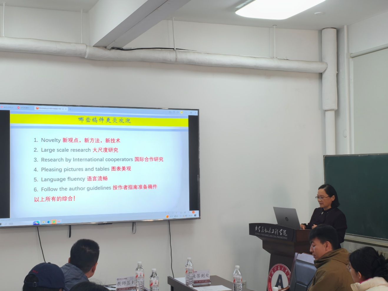 左建平首先对邱敦莲的到来表示欢迎,并简要介绍了与会师生。他在讲话中强调了高质量论文发表对于学术研究的关键意义。他指出,尽管当前学术评价体系日趋多元,但发表高水平论文仍是科研学术道路的重要成果;从历史维度看,著书立说更是学者留名青史的主要方式。相比其他成果形式,在权威期刊上发表论文是记录科学贡献、传播学术思想、确立学者地位的基石与根本。最后,他勉励青年教师和研究生恪守学术道德,珍惜此次交流机会,认真学习国际期刊的投稿规范与写作要求,力争在各自研究领域产出更多具有原创性的高质量成果,共同为提升学院整体科研实力、推动学科建设发展贡献智慧与力量。