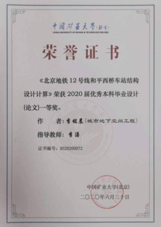 李铭晨同学2020届优秀本科毕业设计(论文)一等奖荣誉证书