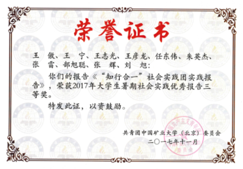 王彦龙同学2017年大学生暑期社会实践优秀报告三等奖荣誉证书