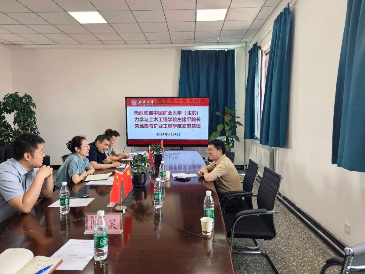 在全面贯彻落实党的二十大精神、深入推进教育强国战略。2024年6月5日,学院院长左建平教授一行前往新疆大学地质与矿业工程学院走访交流。会议重点围绕深化两院合作、党建工作、研究生招生宣传、学科建设及人才培养等议题进行深入交流。此次访问不仅是两校落实“一带一路”倡议、服务国家能源安全与西部大开发战略的生动实践,更标志着我国高等教育在区域协同创新、人才战略布局上迈出了坚实步伐。新疆大学地质与矿业工程学院党委书记孙琳杰,党委副书记、纪委书记阿地力·多力坤、学院党委委员、学术副院长李鑫出席会议,学院党委组织员、教师代表参加会议。
