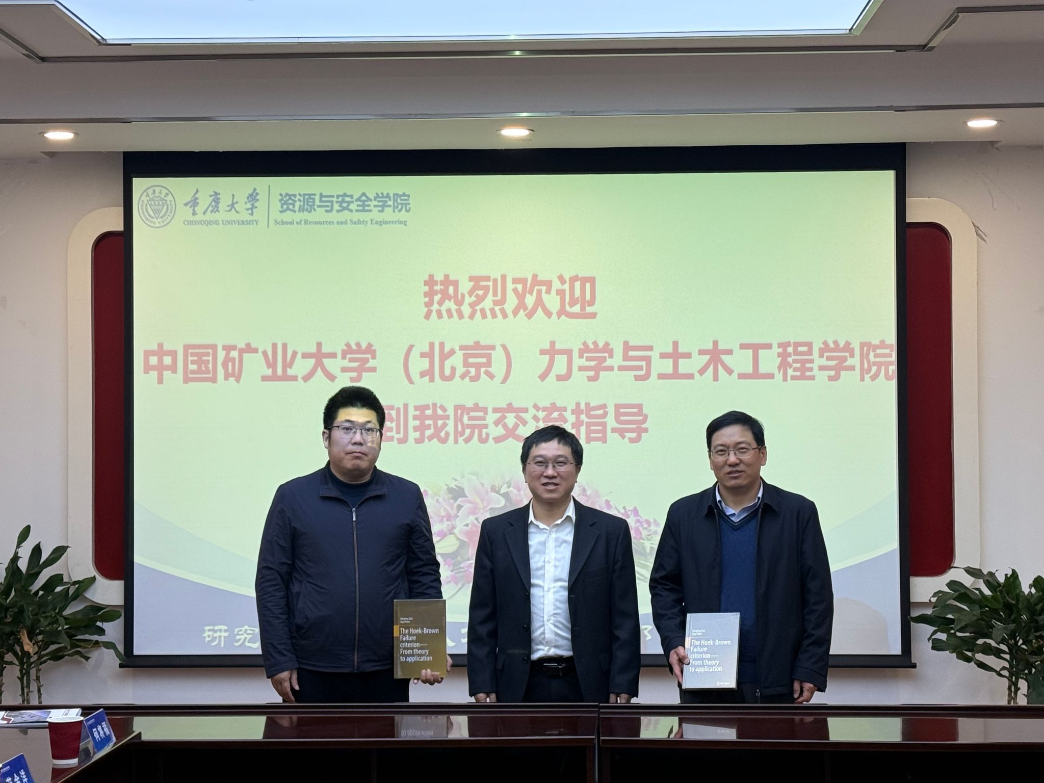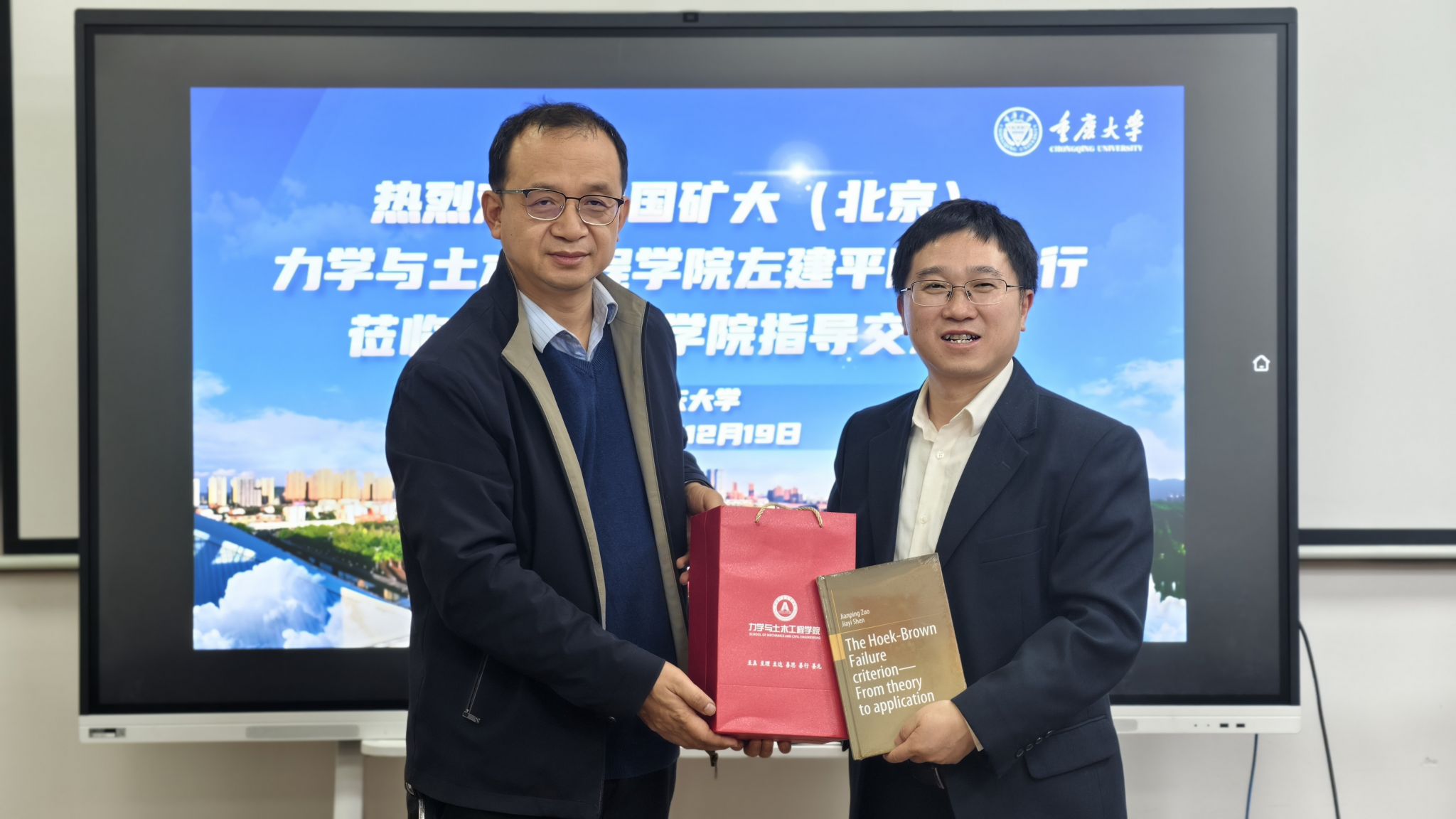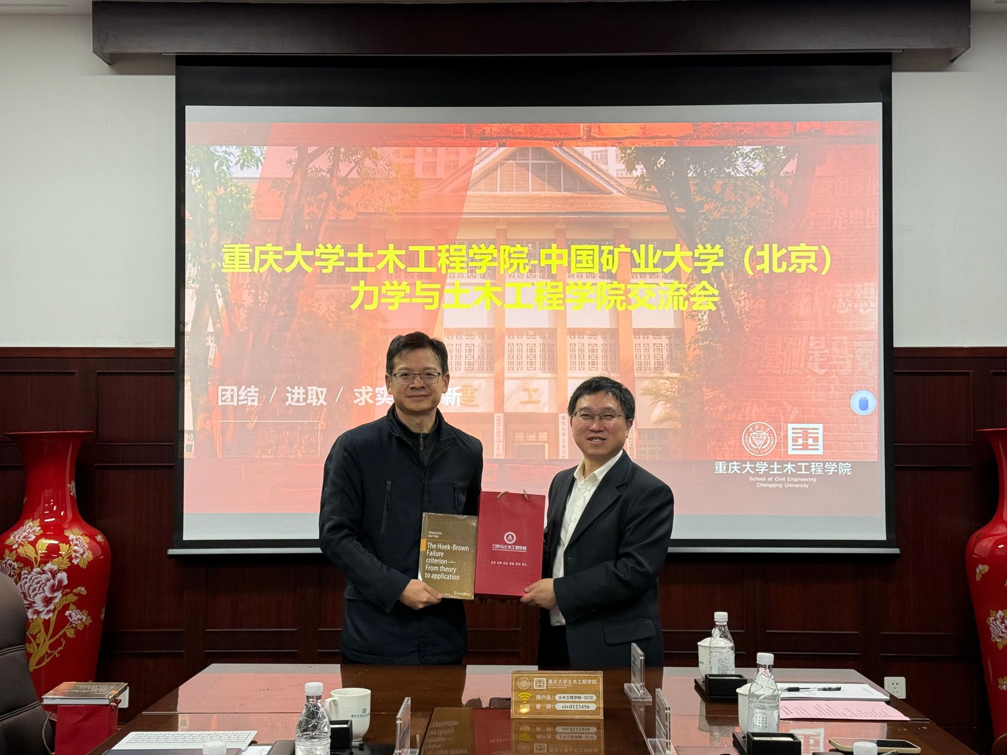 12月22日上午,中国矿业大学(北京)力学与土木工程学院与重庆大学土木工程学院在重庆大学建工馆举行。左建平与土木工程学院党委书记谢强、院长杨庆山进行会谈,院党委副书记、纪委书记陈培稚、教育部重点实验室主任刘纲出席会议。